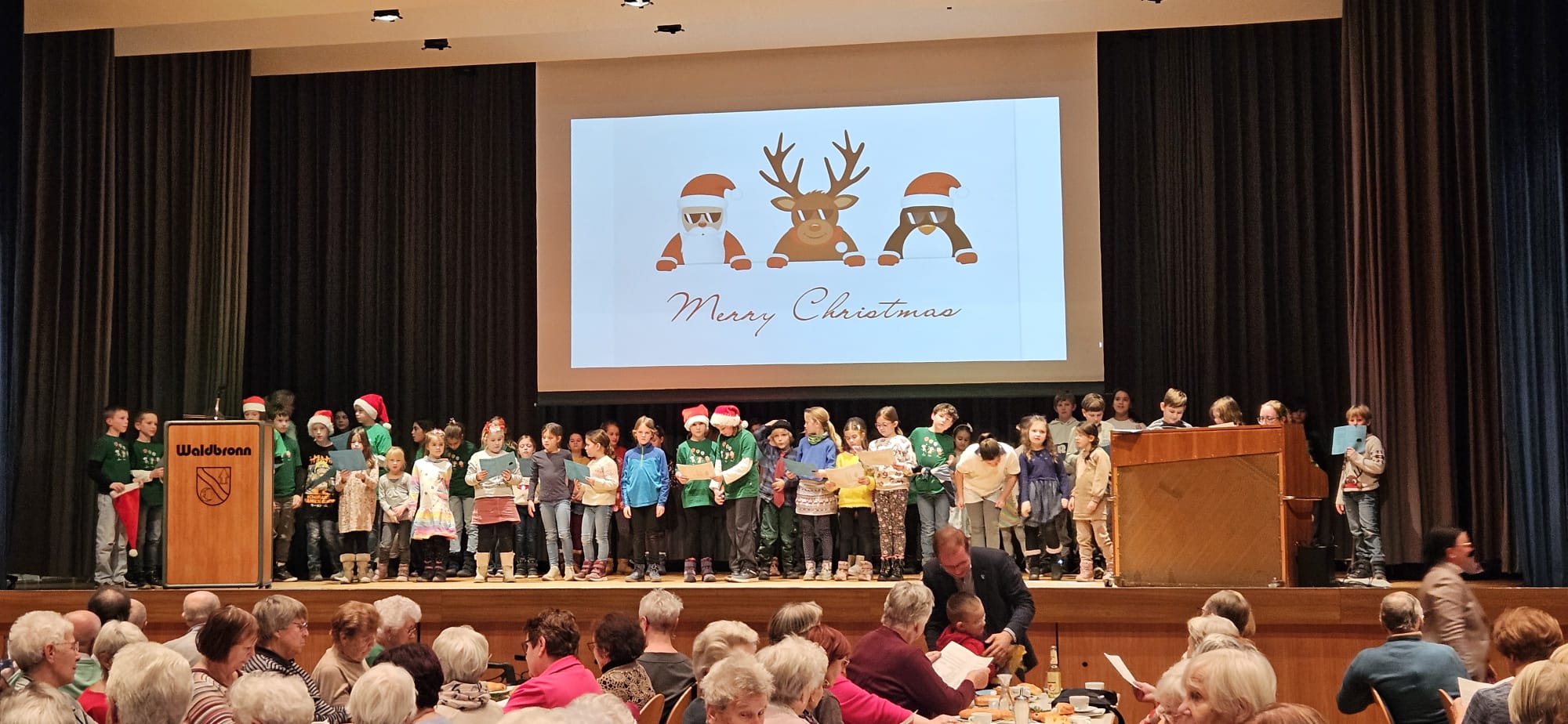 Anschließend spielte die Bläserklasse weihnachtliche Lieder. Wer wollte, konnte kräftig mitsingen; es sogar noch eine Zugabe. Danach haben die Schülerinnen und Schüler lustige Weihnachtsgedichte, Lieder und fetzige Raps vorgetragen. Als Dank für das abwechslungsreiche und stimmungsvolle Programm gab es von den Seniorinnen und Senioren viel Applaus und von der Gemeinde einen leckeren Dambedei. „Das war ein sehr schönes Programm“, so die einhellige Meinung. Natürlich überreichte Bürgermeister Stalf noch jedem Gast einen Weihnachtsstern als kleine Aufmerksamkeit von der Gemeinde. Einen großen Dank an die Schülerinnen und Schüler der Anne-Frank-Schule, an das DRK Etzenrot für den Bereitschaftsdienst, an Benjamin Hesselschwerdt für den Fahrdienst und last but not least an die Brasserie für die hervorragende Bewirtung.