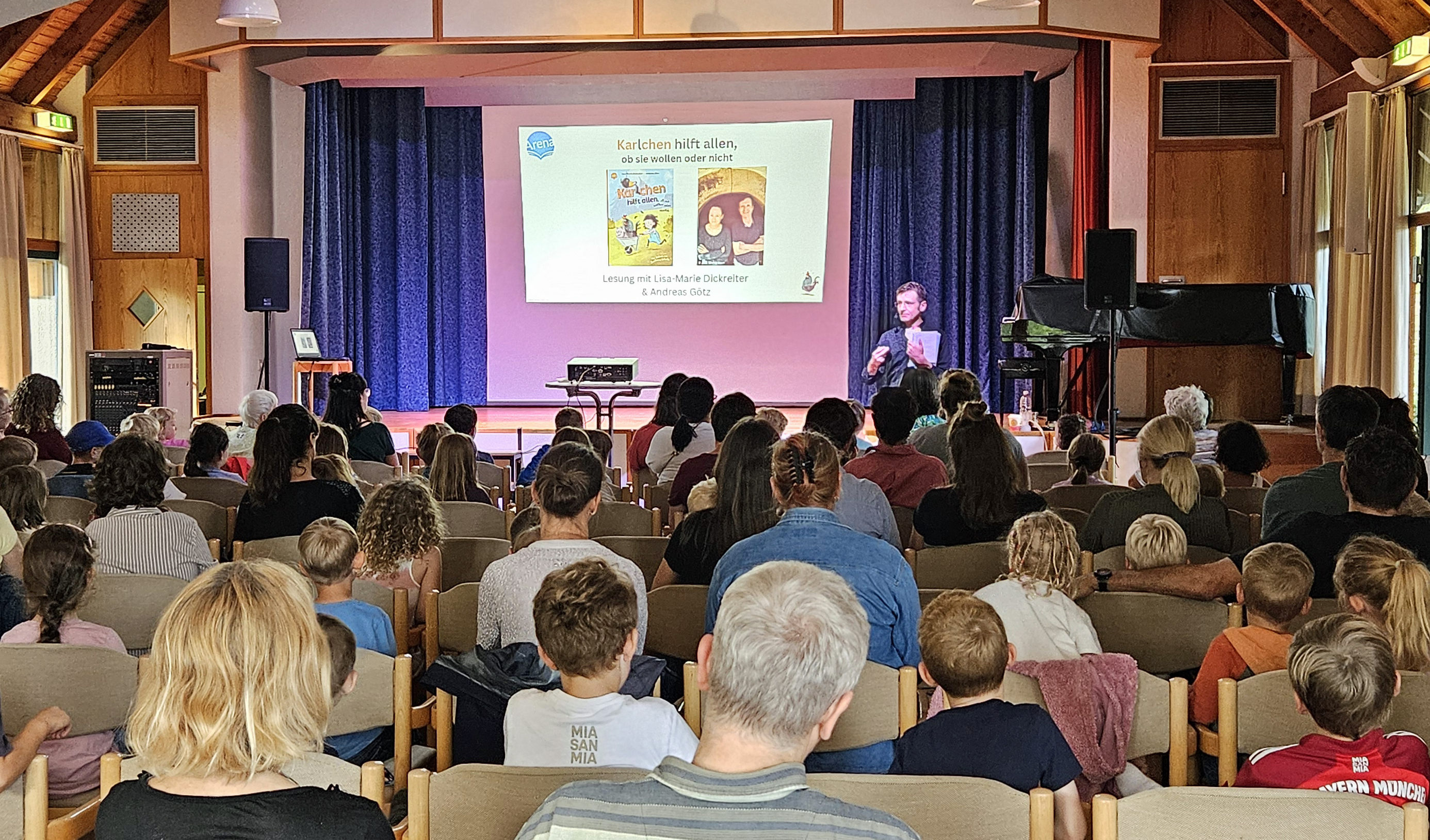 Für die vielen Kids (es war restlos ausverkauft) ein Riesengaudi, zumal es bei den ansprechenden Bildern von Barbara Scholz auch einige Mitmachaktionen gab. Abschließend gab es noch eine leckere Bratwurst von Bürgermeister Christian Stalf und ein Getränk von Desiree Fuchs vom Kulturring. „Karlchen hilft allen, ob sie wollen oder nicht“ wurde 2023 mit dem Deutschen Kinderbuchpreis ausgezeichnet und gibt es jetzt auch im Lesetreff.