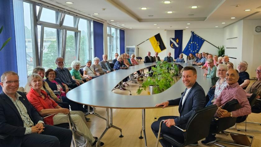 Bürgermeister Christian Stalf begrüßte die anwesenden Gäste aus Monmouth und die Mitglieder des Clubs der Monmouth-Freunde im Bürgersaal. Er erinnerte sich gerne an den Gegenbesuch im letzten Jahr zurück. „Eine starke und gute Städtepartnerschaft wie unsere ist sehr wichtig und wertvoll. Sie muss in die Zukunft weitergetragen werden und deshalb freue ich mich sehr, dass wir uns in diesem Jahr wieder treffen können“, sagte er bei der Begrüßung.