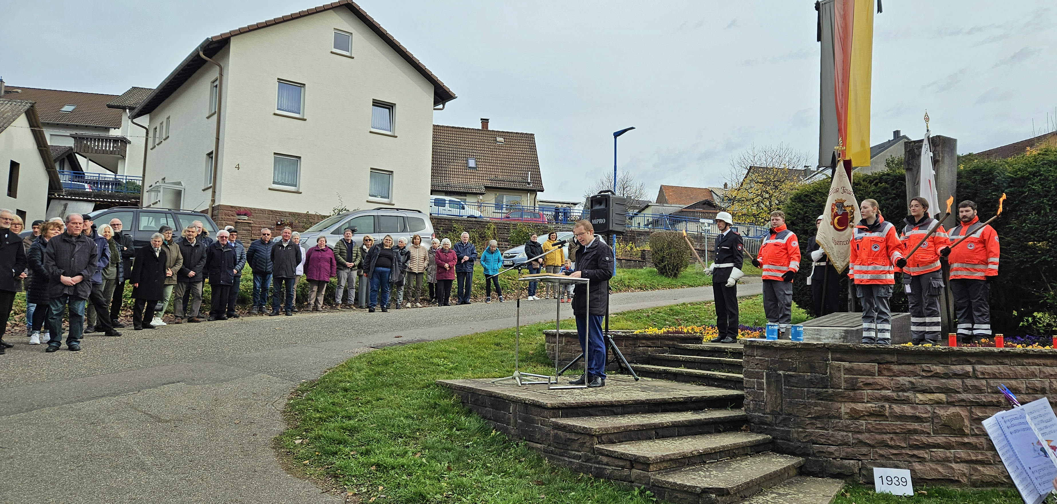 Abschließend bedankte sich Bürgermeister Stalf bei allen Beteiligten, die zum Gelingen der Feierstunde beigetragen haben, bei den Hortkinder der Waldschule für die Gestaltung der Kacheln, dem Musikverein Harmonie Etzenrot für die musikalische, modere Gestaltung, bei Ruth Fehling für die Ansprache und bei der Freiwilligen Feuerwehr sowie dem DRK Etzenrot für die Ehrenwache.