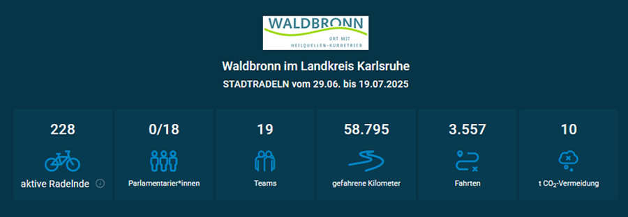 Bürgermeister Christian Stalf zeigt sich erfreut über das tolle Ergebnis des diesjährigen Stadtradelns in Waldbronn: „Ich danke allen, die mitgeradelt sind – ob im Team oder einzeln. Jeder Kilometer zählt für den Klimaschutz und für unsere Gesundheit. Es ist schön zu sehen, wie engagiert sich unsere Bürgerinnen und Bürger für eine nachhaltige Mobilität einsetzen.“