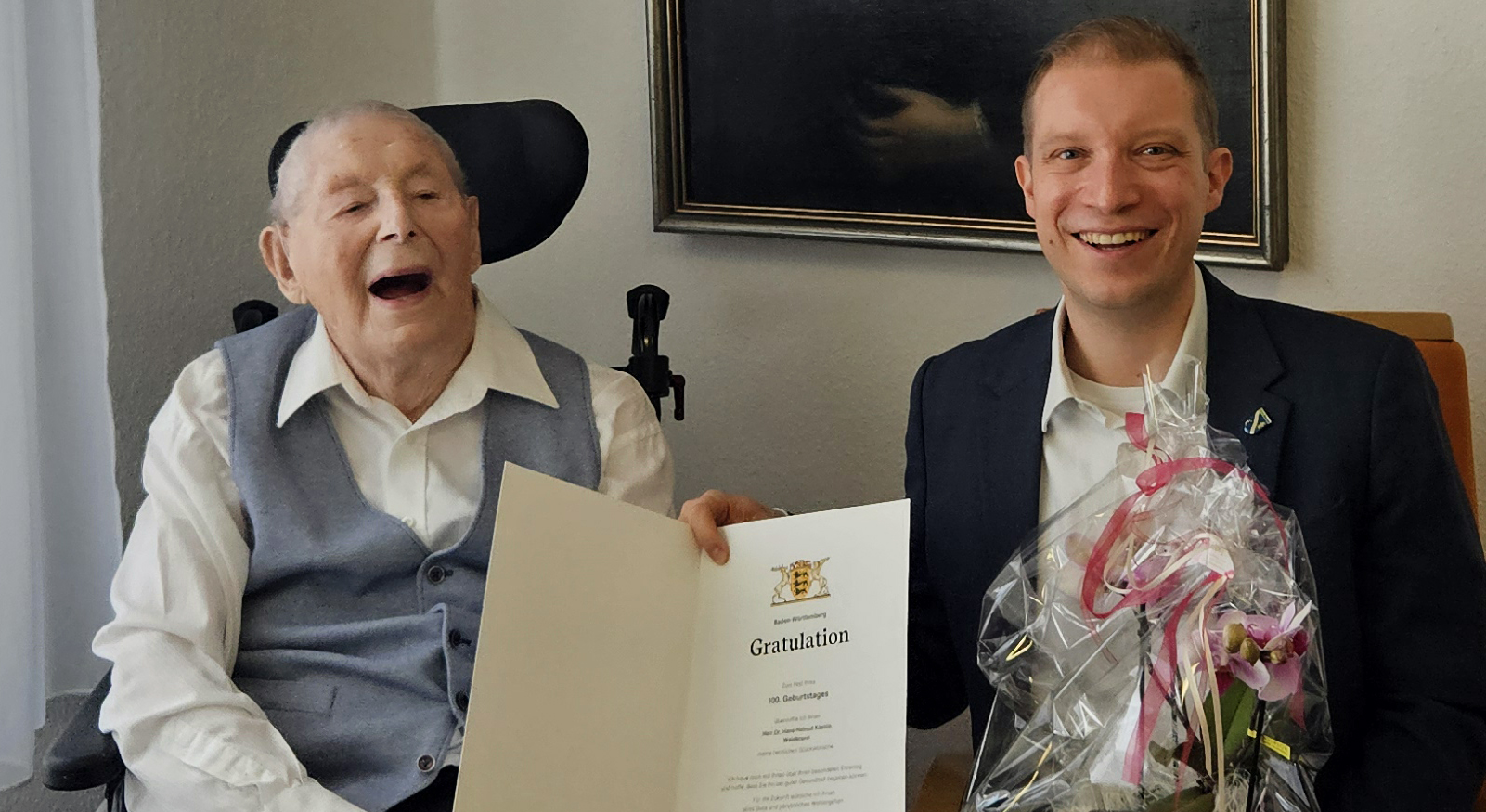 Ein ganz besonderer Anlass führte Bürgermeister Christian Stalf in diesen Tagen ins Waldbronner Seniorenhaus am Rathausmarkt: Er durfte Dr. Hans-Helmut Köstlin zu seinem 100. Geburtstag gratulieren – ein Ereignis, das wahrlich nicht alle Tage vorkommt.