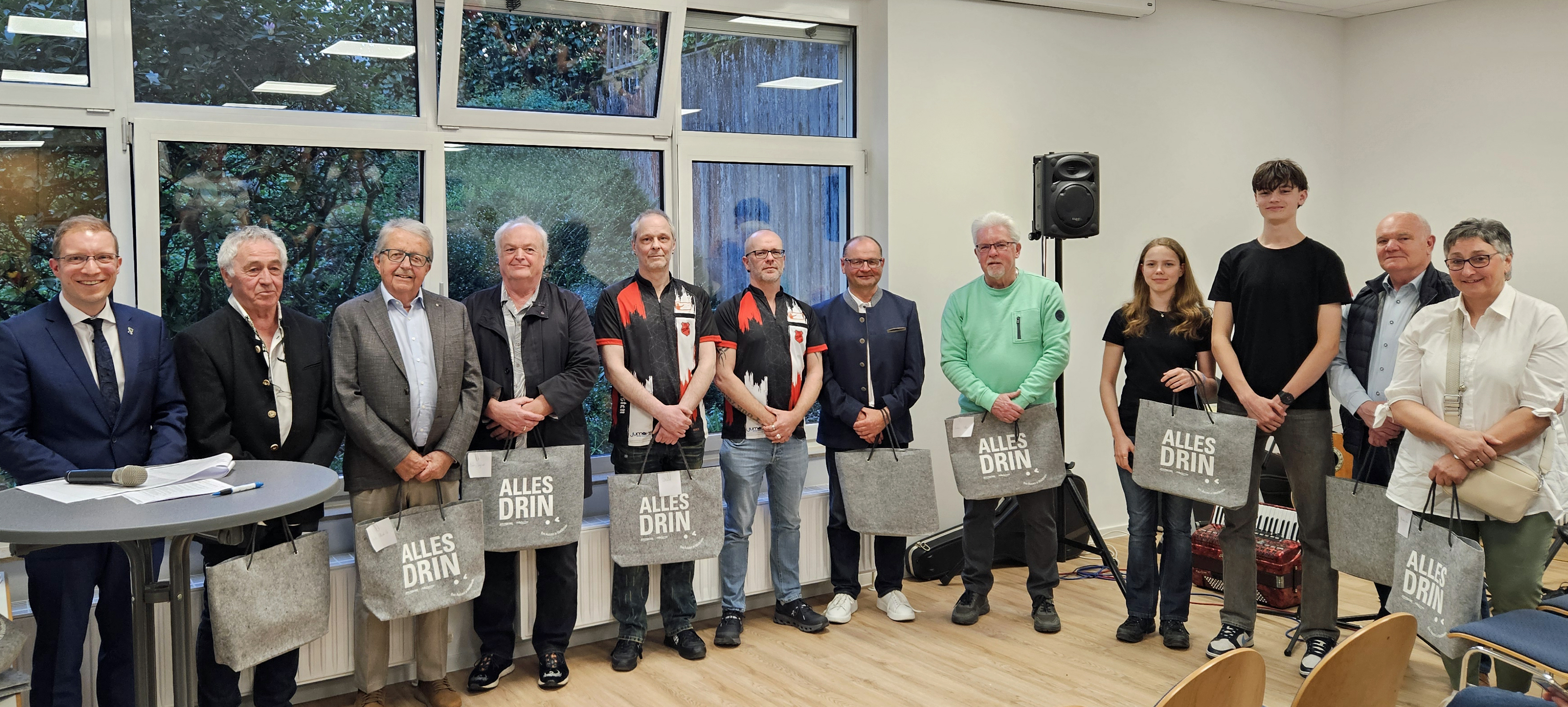 Geehrt wurden langjährige Blutspenderinnen und Blutspender (siehe vergangene Woche) sowie Ehrenamtliche, die sich in unseren Musik-, Sport-, Kultur und sozialen Vereinen und Einrichtungen in besonderer Weise verdient gemacht haben. Die Vereine und Einrichtungen sind das „Herzstück unseres gesellschaftlichen Lebens“, betonte Bürgermeister Christian Stalf, der knapp 50 zu ehrende Personen im Waldbronner Saal begrüßen konnte. Mit ihrem unermüdlichen Einsatz, ihrer Zeit und ihrem Engagement tragen Ehrenamtliche entscheidend dazu bei, dass das Vereinsleben in unserer Gemeinde lebendig bleibt. Sie fördern Gemeinschaft, schaffen Zusammenhalt und machen unsere Gemeinde lebens- und liebenswert. „Wir ehren Menschen, die bereit sind, Verantwortung zu übernehmen, die Zeit schenken, die helfen, unterstützen, anpacken – oft ganz selbstverständlich und häufig im Hintergrund“, sagte Stalf. Für die musikalische Unterhaltung sorgte das Heimatstuben-Duo Kurt & Harald.