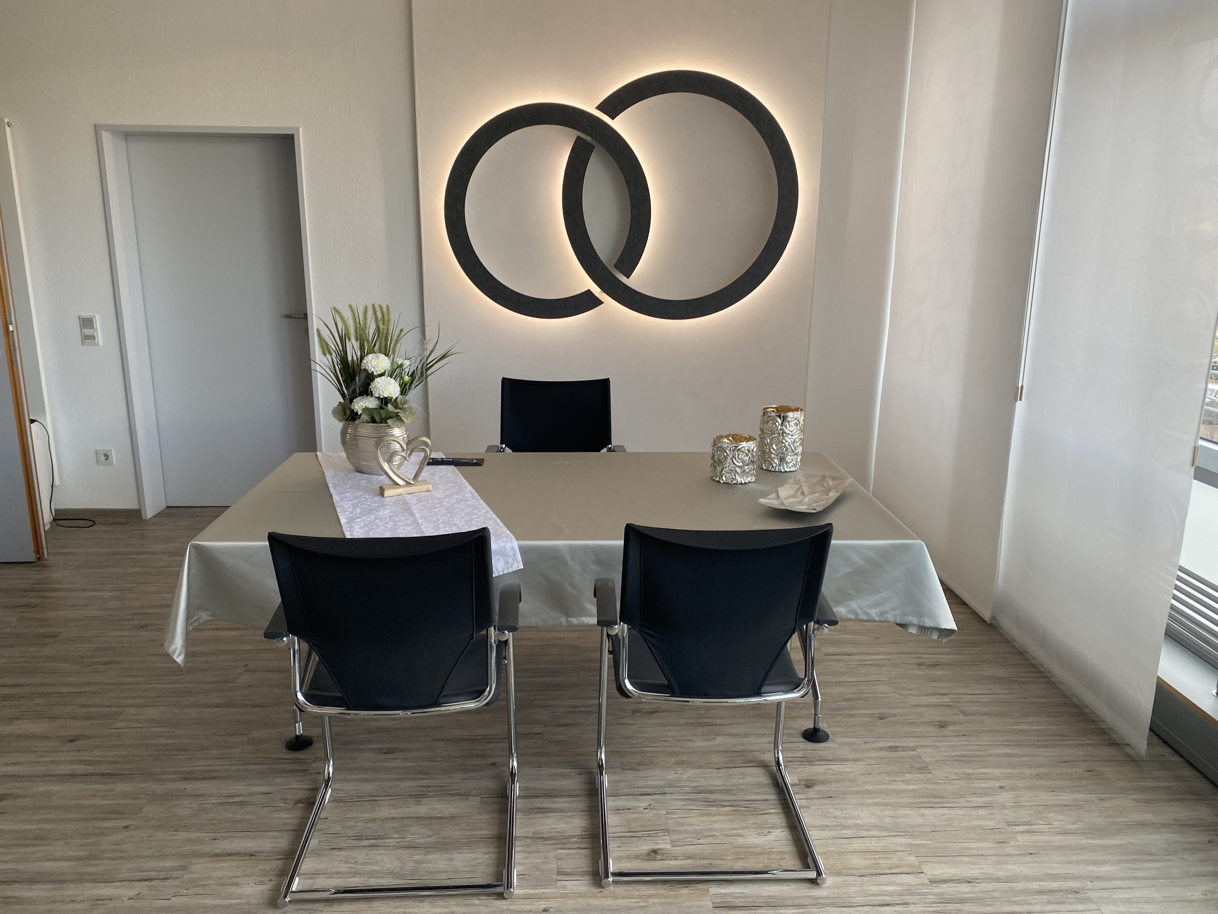 Das modern gehaltene und Licht durchflutete Trauzimmer der Gemeinde befindet sich im 1. Obergeschoss des Waldbronner Rathauses und ist barrierefrei (Aufzug) zu erreichen.