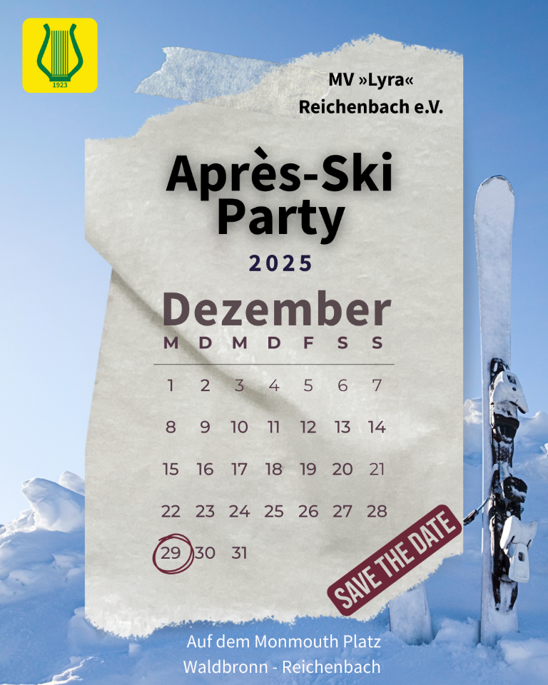 APRÈS SKI PARTY 2025🎿❄️ Am 29.12.2025, ab 19 Uhr 📍 Monmouth Platz Waldbronn - Reichenbach 🔥 Heiße Beats 🍻 Eiskalte Drinks 🍴 Hüttensnacks Kommt vorbei und feiert mit uns! 🎉